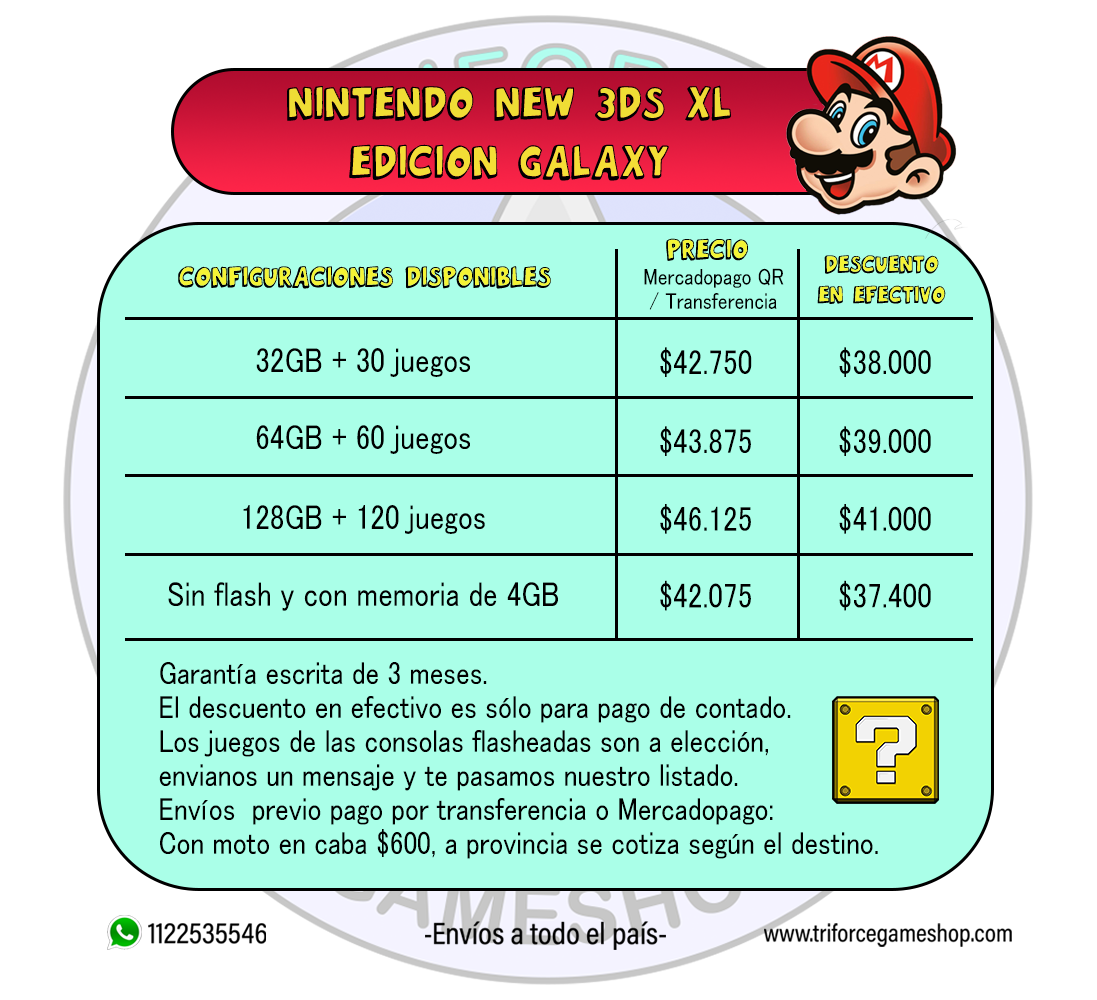 NEW 3DS XL GALAXY TABLA PRECIOS Publicado 11 febrero, 2022 a las 1097 × 1000 en Nintendo 2ds/3ds – Consolas ← Anterior Siguiente →